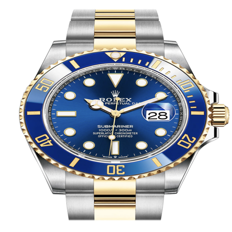 Stainless Steel and 18K Yellow Gold Bracelet . Uni-directional rotating Blue ceramic bezel. Blue dial with index hour markers. Dial Type: Analog. Date display at the 3 o'clock position. Rolex Calibre 3235 Automatic movement, based upon Rolex 3035, containing 31 Jewels, bitting at 28800 vph, and has a power reserve of approximately 70 hours. Scratch resistant sapphire crystal. Screw down crown. Solid case back. Round case shape, case size: 41 mm. Oysterlock clasp. Water resistant at 300 meters / 1000 feet. Functions: date, hour, minute, second, chronometer. Submariner Series. Luxury watch style. Watch label: Swiss Made. Item Variations: M126610LV-0002. Automatic Chronometer Black Dial Men's Watch 126613LN 126613 New Release 2020